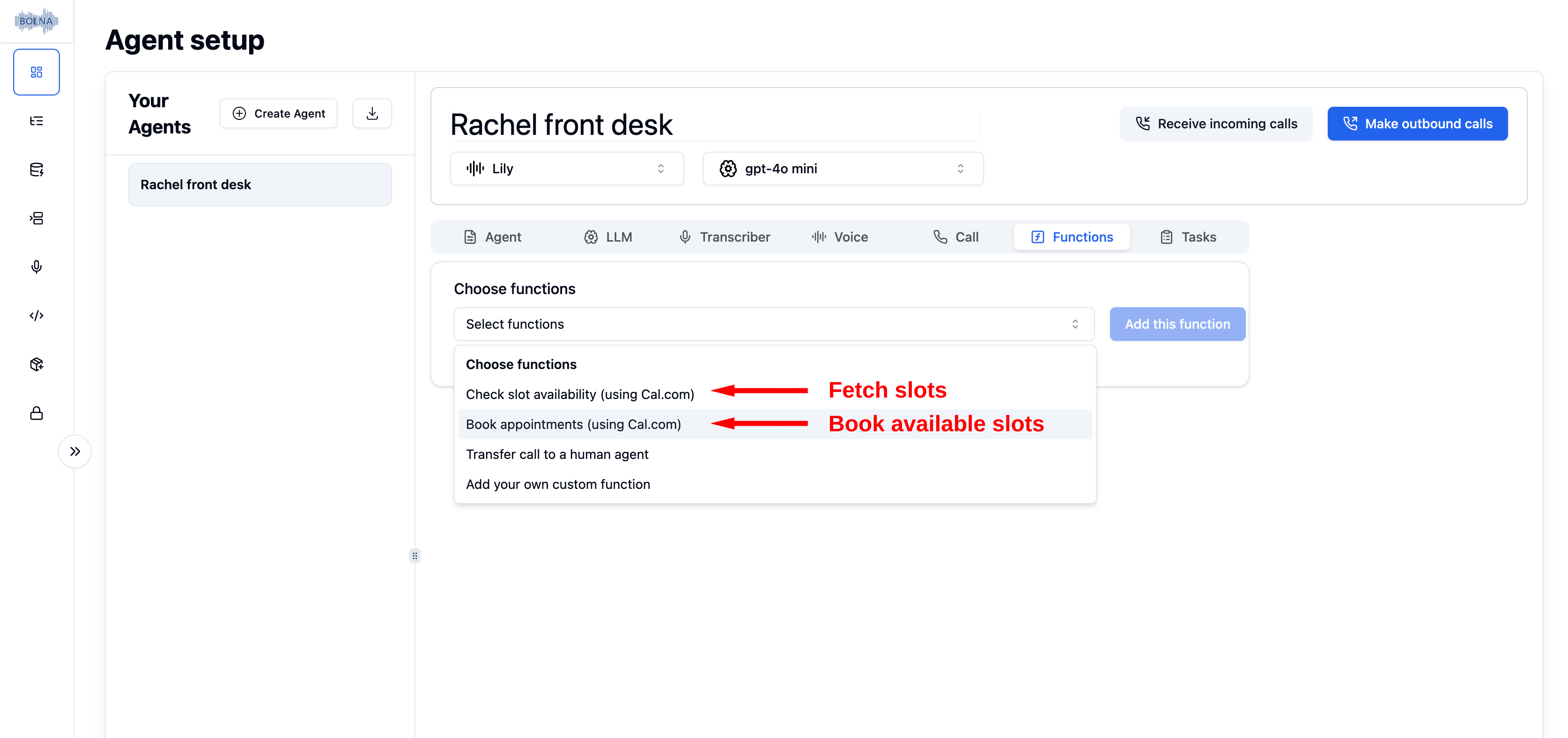 Simply add functions to book calendar appointments(cal.com), transfer calls to human agents in real time, or even create your own function calls